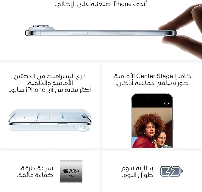 شريحة A19 برو. سرعة فائقة. كفاءة فائقة. – شريحة A19 برو هي الأكثر كفاءة بين شرائح آيفون حتى الآن. تمنحك أداءً احترافيًا بتصميم نحيف وخفيف الوزن.